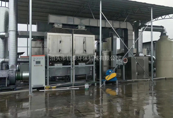 設(shè)備原理:在催化劑的作用下,有機廢氣在較低的起燃溫度下(250~400℃),發(fā)生無焰燃燒,碳?xì)浠衔锉谎趸纸鉃镃O2和H2O,同時放出大量熱能。 設(shè)備優(yōu)勢:安全性好、凈化效率高、操作費用低 設(shè)備應(yīng)用:中高濃度(500mg/m3-5000 mg/m3)的有機廢氣凈化,低濃