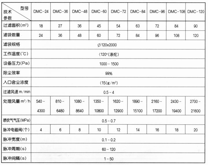 DMC型脈沖袋式倉(cāng)頂除塵器 DMC型脈沖袋式倉(cāng)頂除塵器適宜布置在各種粉料貯存庫(kù)的頂部,用于捕集各種細(xì)小干燥非纖維粉塵。 主要技術(shù)參數(shù): DMC型脈沖袋式倉(cāng)頂除塵器主要技術(shù)參數(shù)見(jiàn)表,在選型時(shí)應(yīng)注意入口粉塵濃度,在技術(shù)性能上,透過(guò)濾袋的氣流速度(即過(guò)濾風(fēng)