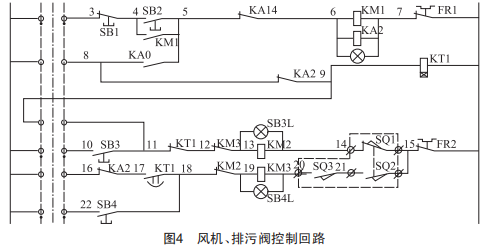 風機、排污閥控制回路如圖4所示,圖中3~22為接線端子編號,KA14為基本水位繼電器常閉節(jié)點,除塵器長時間處于停運狀態(tài)并且排污閥存在漏水現(xiàn)象,水箱內(nèi)部大部分水流失。遠程啟動風機時,負壓對水箱水位造成波動,使基本水位信號消失,KA14斷開,風機停運聯(lián)鎖排污閥打開,同時進水電磁閥動作,KT1計時時間到后排污閥關(guān)閉。關(guān)閉到位,進水電磁閥保持進水,基本水位信號亮起,KA14閉合,風機啟動,造成基本水位信號消失。之后不斷循環(huán)以上步驟,浪費大量水源及影響設備正常運行,需要及時對排污閥漏水問題進行處理。