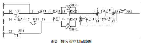 (2)回路元器件損壞。如圖2所示,按下sB4按鈕,限位正常,關(guān)排污閥無反應,需要查看熱偶FR2是否動作,或查看接觸器KM3是否缺相及節(jié)點損壞。熱偶動作需要復位,并檢查閥桿是否卡澀及超過行程,結(jié)合實際問題進行處理。