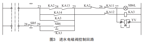 進水電磁閥控制回路如圖3所示,圖中23~29為接線端子編號,除塵器上水流程是電磁閥YV打開,水位到達備用水位時,觸發(fā)KA11動作,KA11的常閉節(jié)點斷開,電磁閥失電,停止注水。導致水箱漫水的原因主要有以下幾種: