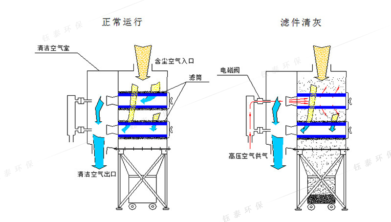 濾筒除塵器的主要構造是由除塵室、脈沖反吹清灰系統(tǒng)和集塵室組成。當含塵空氣進入除塵室后,被圓筒形的濾筒材質阻隔,亞微米以上的粉塵被阻留在濾筒外表面上,過濾凈化后的氣流就從濾筒