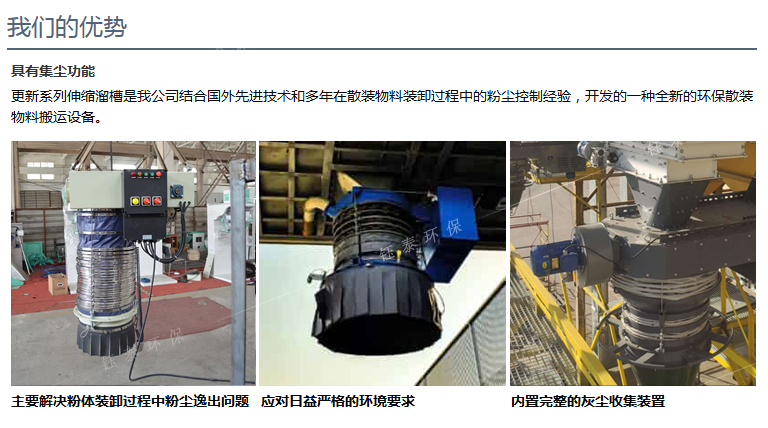 服務(wù)電話:13091153069(同微信)伸縮式卸料管是一種物料處理設(shè)備,用于將粉末和干散狀物料無(wú)塵地裝入或卸入容器、卡車(chē)和船只。它是一種自動(dòng)化且靈活的解決方案,可以根據(jù)不同行業(yè)的需求進(jìn)行定制。伸縮式卸料管系統(tǒng)的主要功能是通過(guò)垂直的鐵管利用物料自身的重量排放粉末或顆粒狀散裝固體,同時(shí)通過(guò)外層的一層帆布材料的布筒收集卸料時(shí)產(chǎn)生的粉塵。為了適應(yīng)上部排放點(diǎn)和下部裝載點(diǎn)之間的不同高度,鐵管被設(shè)計(jì)為可伸縮的。鐵管的靈活性是伸縮式卸料管系統(tǒng)的關(guān)鍵特性,它允許根據(jù)不同的排放和裝載點(diǎn)進(jìn)行調(diào)整,使其成為廣泛應(yīng)用的多功能解決方案。