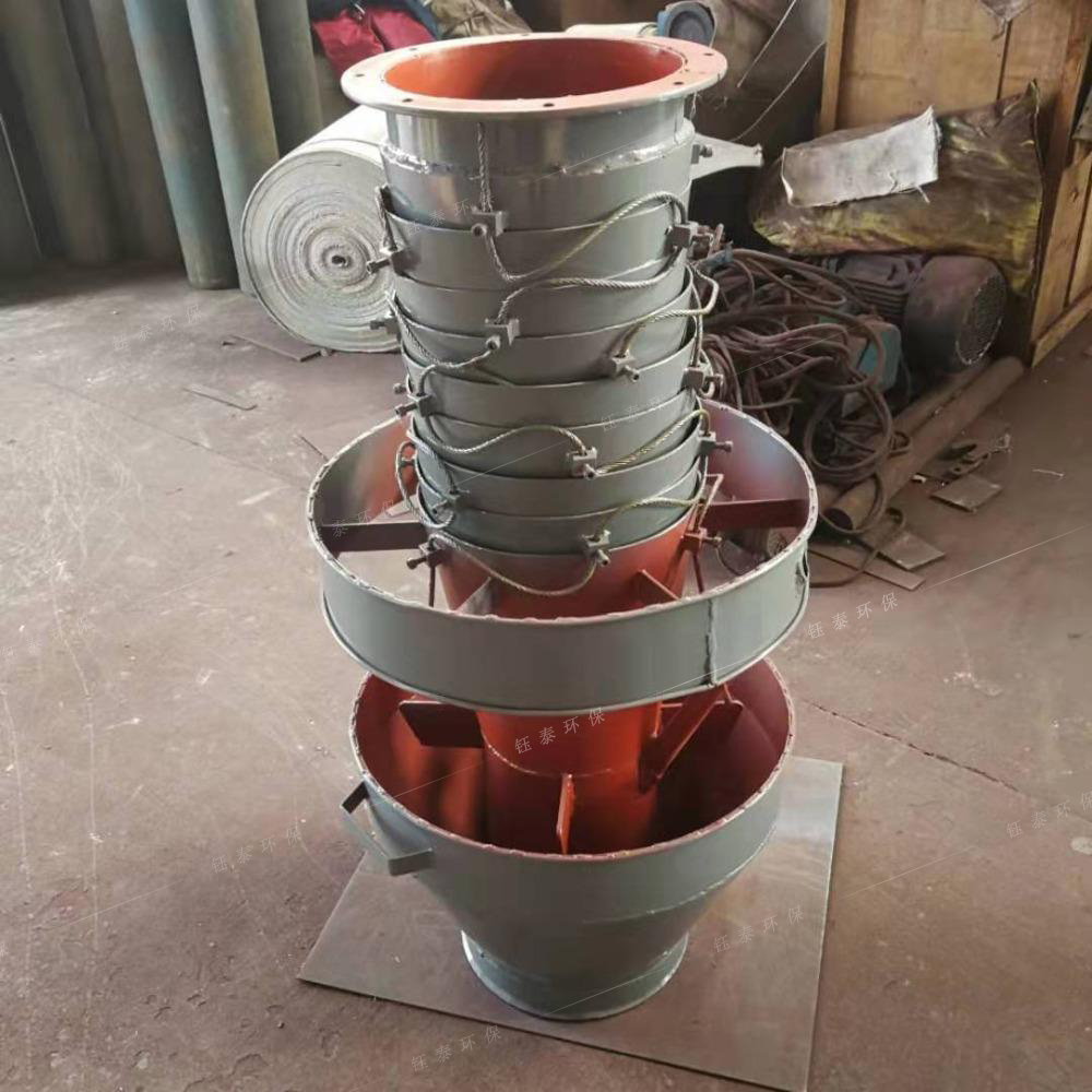 制作外伸縮布袋方式:要求伸縮布袋上每2個(gè)相鄰漲圈之間的垂直間距必須≤10cm,見圖1。當(dāng)外伸縮布袋折疊后2個(gè)相鄰漲圈之間的布袋向內(nèi)褶皺時(shí),不能阻擋住與內(nèi)直鋼套筒外壁之間形成的環(huán)形負(fù)壓吸塵通道的橫截面,從而降低負(fù)壓吸塵的通過量??蛻羰褂矛F(xiàn)場(chǎng)反饋漲圈間距大的吸塵氣流明顯比漲圈間距小的吸塵氣流更加順暢。