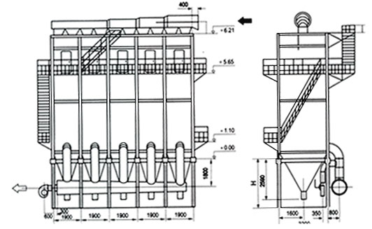 該設(shè)備由含塵氣體入口至凈化煙氣出口,本體結(jié)構(gòu)由進氣管路、進氣室、袋室、灰斗、排灰閥、出口管道及反吹風(fēng)系統(tǒng)和清灰控制系統(tǒng)所組成。